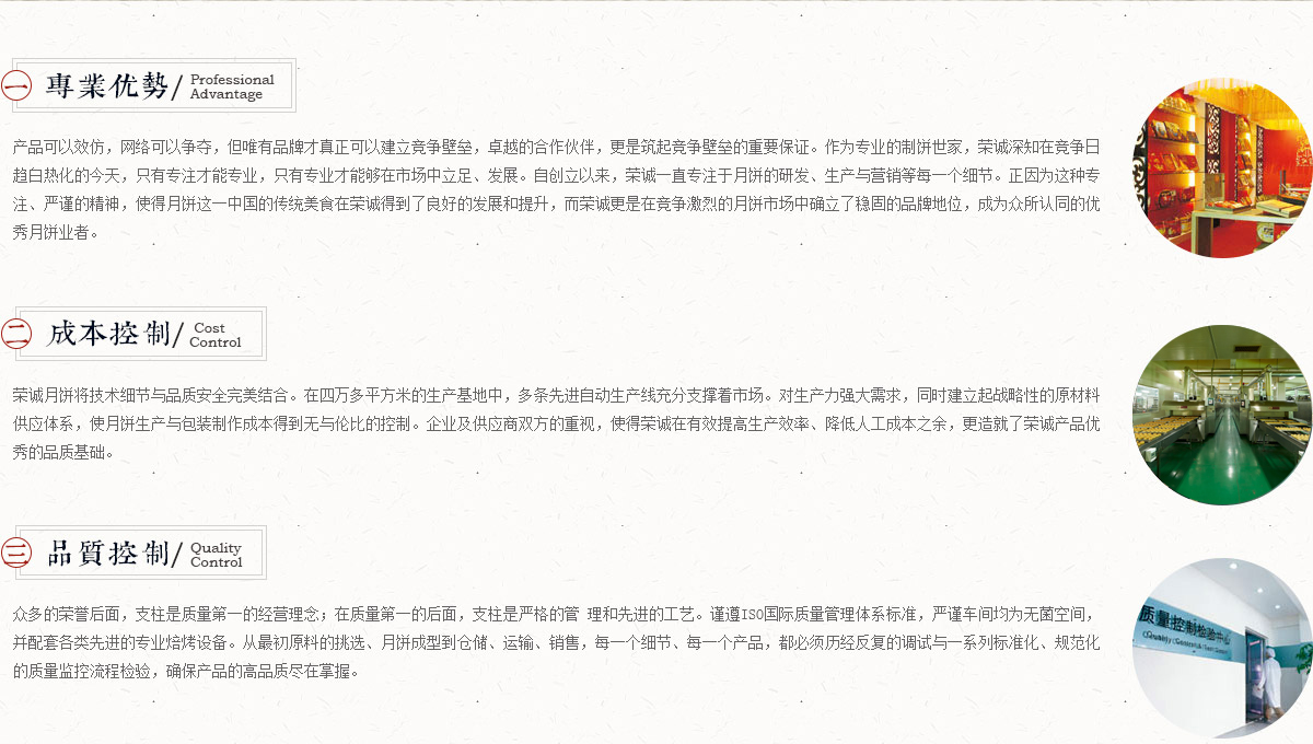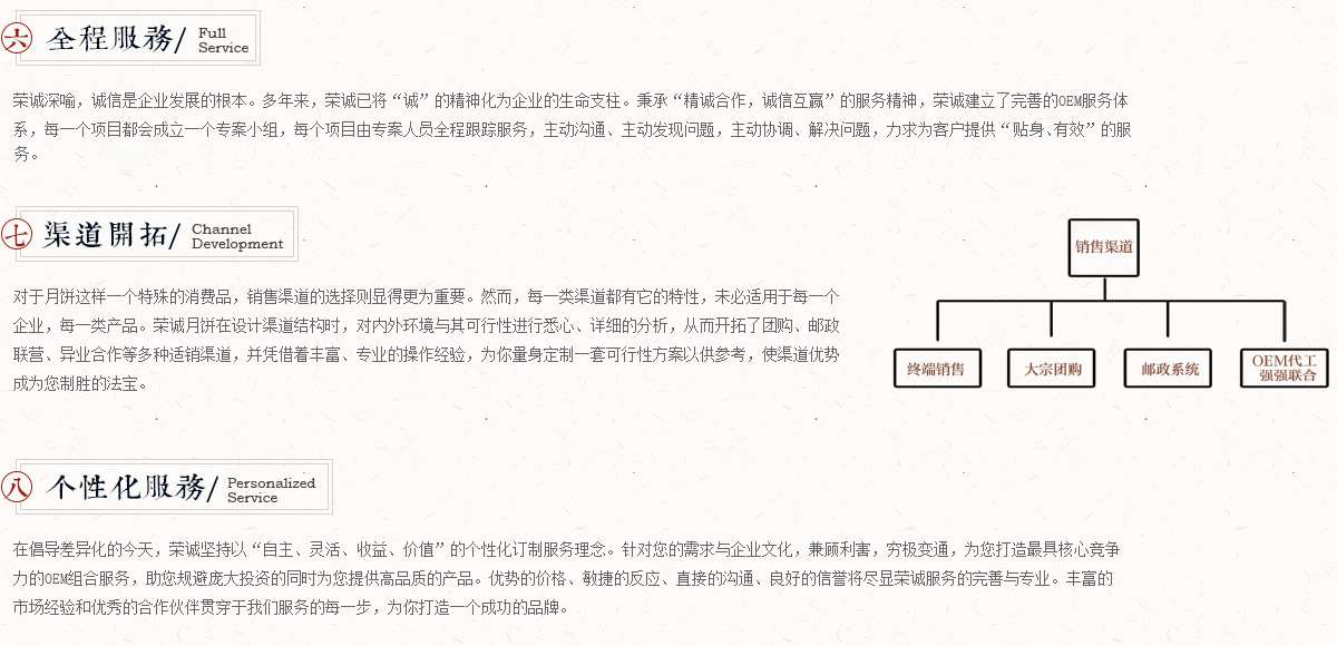 榮誠(chéng)作為一家高標(biāo)準(zhǔn)、規(guī)范化、規(guī)模化的專(zhuān)業(yè)烘焙生產(chǎn)企業(yè),依靠強(qiáng)大的專(zhuān)業(yè)能力,每年可為上千家企業(yè)提供形式靈活、創(chuàng)意時(shí)尚的個(gè)性化定制服務(wù),業(yè)務(wù)類(lèi)型覆蓋:合作授權(quán)定制、酒店禮食定制、渠道創(chuàng)意定制、集團(tuán)福利個(gè)性化定制、跨界聯(lián)名定制等各式各樣的定制需求。榮誠(chéng)與多個(gè)省市的中國(guó)郵政、中國(guó)聯(lián)通等大型企業(yè)單位建立長(zhǎng)期合作,提供專(zhuān)屬定制禮食產(chǎn)品,接受客戶(hù)及第三方檢測(cè)機(jī)構(gòu)的專(zhuān)業(yè)嚴(yán)格驗(yàn)廠。在渠道端二十多年的市場(chǎng)耕耘,榮誠(chéng)與沃爾瑪、大潤(rùn)發(fā)、世紀(jì)聯(lián)華等各大連鎖KA賣(mài)場(chǎng)建立穩(wěn)定的合作,產(chǎn)品與服務(wù)獲得消費(fèi)者的廣泛認(rèn)可。