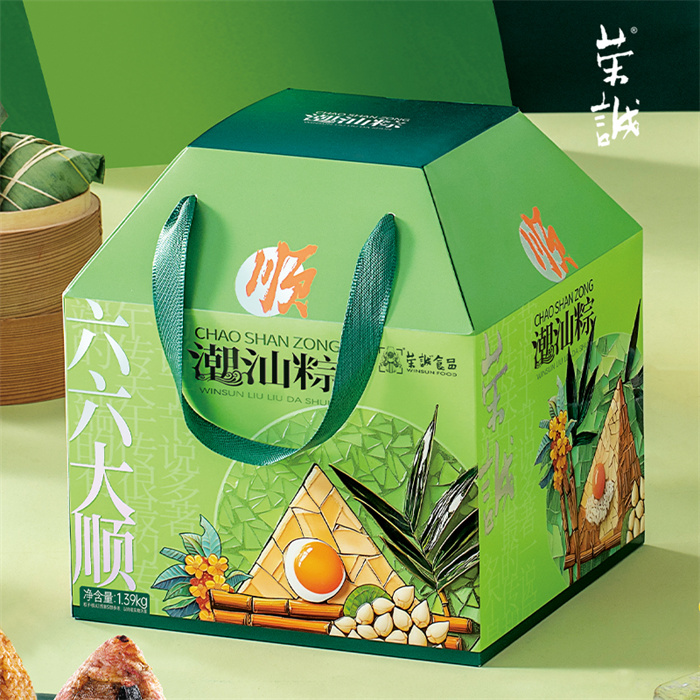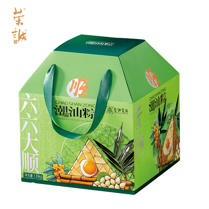 【編 碼】 HZZ2505 【條形碼】 6925755536908 【尺 寸】 23x23x25cm 【凈含量】 1.39kg 【規(guī) 格】 1.39kgx6盒/箱 【內(nèi)容物】  100g潮汕鮮腌烏欖黑豬肉粽x2,100g潮汕地道鹵水肉粽x2,100g潮汕秘制菜脯鮮鴨肉粽x2,100g潮汕蜜制桂香糯藕粽x2,100g豆沙粽x2,35g腐乳餅x6,30g滋芯綠豆糕(海鹽檸檬味)x6